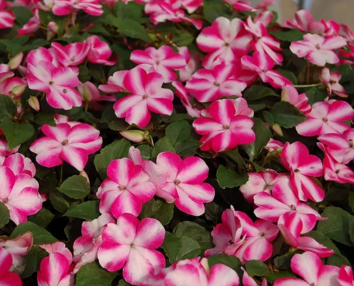 Семена Бальзамина Баланс Роуз Стар прорастают уже через 2 недели после посадки, а первыми бутонами они порадуют уже через 3-4 месяца. Небольшой, изящный куст с большим количеством зеленый листьев и многочисленными боковыми побегами формирует полусферу, которая красиво смотрится на клумбах, рабатках, альпинариях. Подходят эти цветы и для высадки в горшки, подвесные корзины. Бутоны насыщенно малинового цвета и белыми прожилками в виде звезды раскрываются дружно, практически полностью скрывая собой зелень. Сезон цветения заканчивается в сентябре-октябре.
