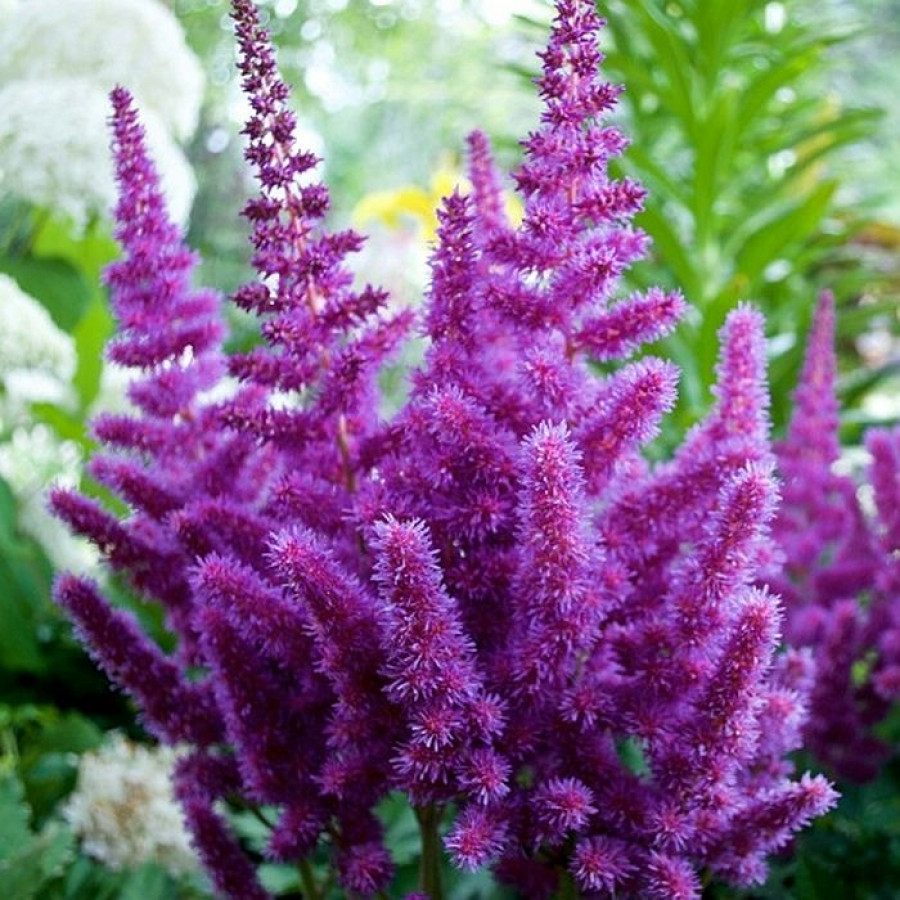 Астильба китайская Блэк энд Блу (Black and Blue) принадлежит одному из самых красивых сортов этого растения. Крупные ромбовидные соцветия окрашены в яркий фиолетово-сиреневый оттенок. При высоте цветоноса в 80 сантиметров, на цветущую часть приходится более 20 сантиметров. Одновременно на одном растении образуется несколько стеблей, создавая пышный цветущий куст, распространяющий приятный медовый аромат. Любоваться цветением Астильбы китайской Блэк энд Блу можно около месяца в середине лета. Данный сорт не выносит прямых солнечных лучей, поэтому поместите саженцы в кружевную тень. Компанию астильбе составят хосты, бадан, барвинок, колокольчики, садовая герань.