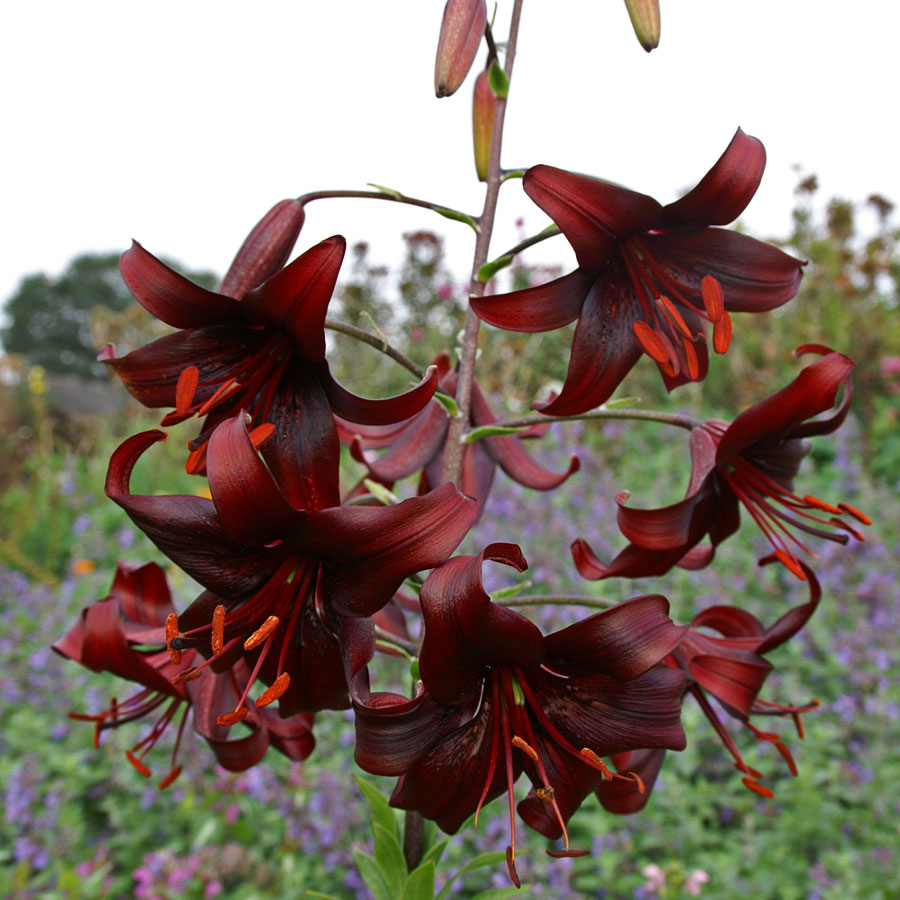 Лилия азиатская Найт Флаер - красивый цветок темно-бордового цвета, с темным незаметным крапом. Лепестки немного завёрнуты вверх. Период цветения июль-август. Цветок крупный, а высота стебля, на котором он расположен, достигает 140см.