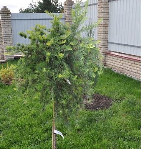 Штамбовая форма. Высота зависит от места прививки, штамб 1 - 1,5 метра. Ветви слегка закрученные по спирали. Kopа красновато-коричневая, трещиноватая. Хвоя игольчатая, нежная, зеленая, осенью - золотисто-желтая. Годовой прирост в высоту 25 см, в ширину 15 см. В молодом возрасте растет медленно, затем быстрее. Светолюбива. К почвам требовательна. Лучше растет на хорошо дренированных, плодородных супесях и суглинках, не выносит застоя влаги и засухи. Морозостойка, но может страдать от поздневесенних заморозков. Применение: одиночные посадки, группы, аллеи
