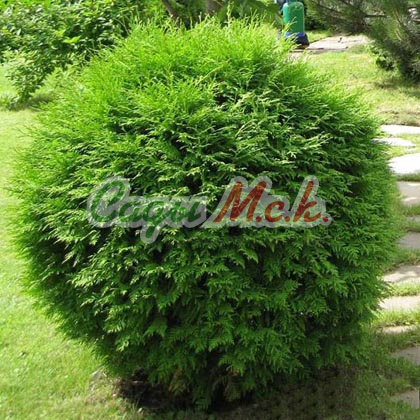 Туя западная Recurva Nana - карликовый кустарник до 2 м высоты и такого же диаметра. Крона шаровидная. Ветви прямые и восходящие. Веточки скрученные. Хвоя чешуйчатая, густая, матово зеленая, зимой буровато-зеленая.